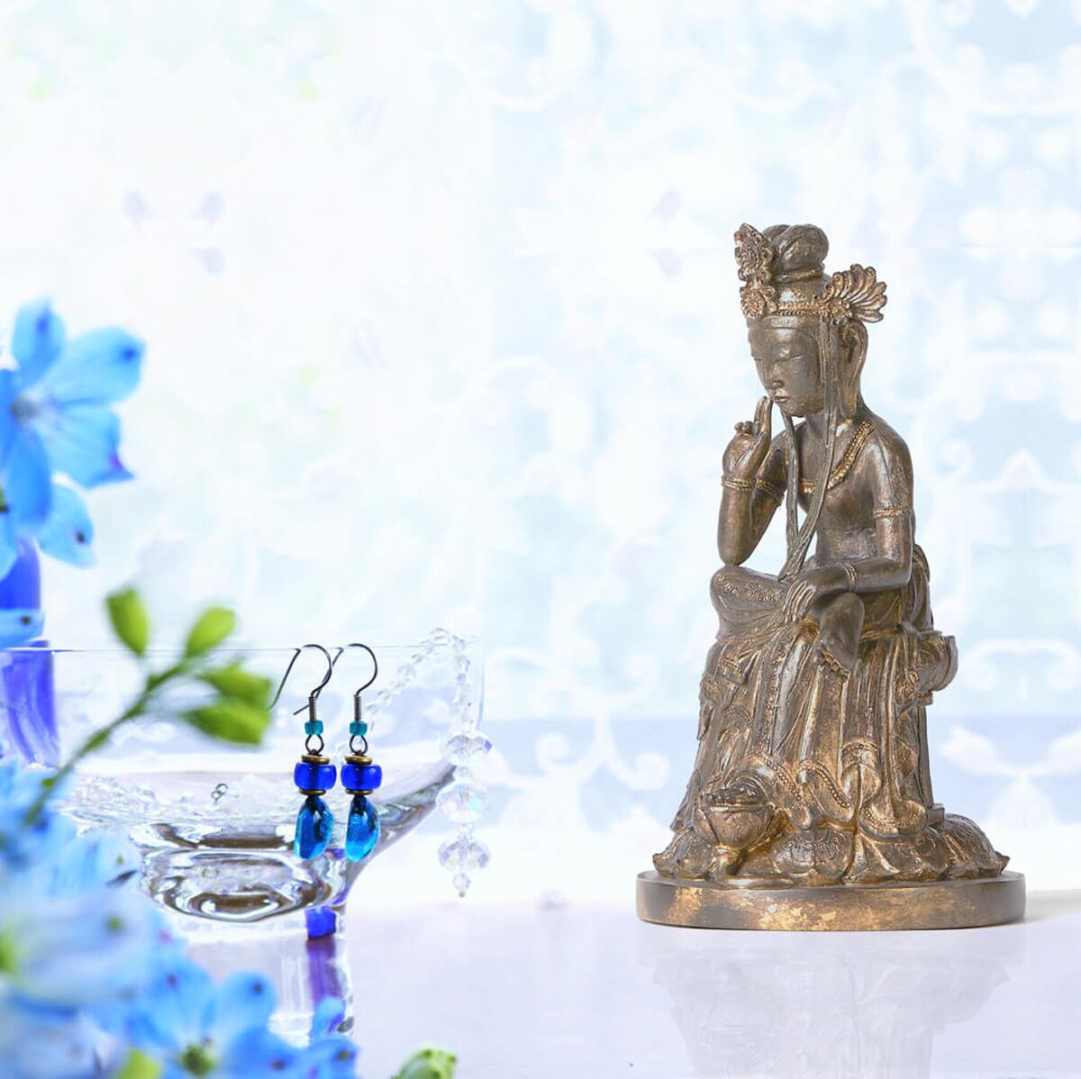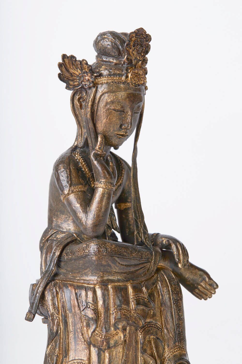 右足を左足の腿の上に乗せ、右手で頬杖をつくように思索を巡らせる半跏思惟のポーズがよく知られており、これは私たちを助ける方法を熟思している姿です。