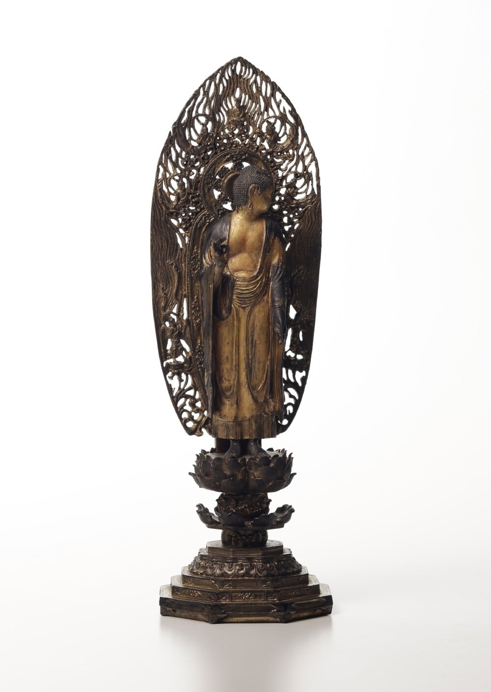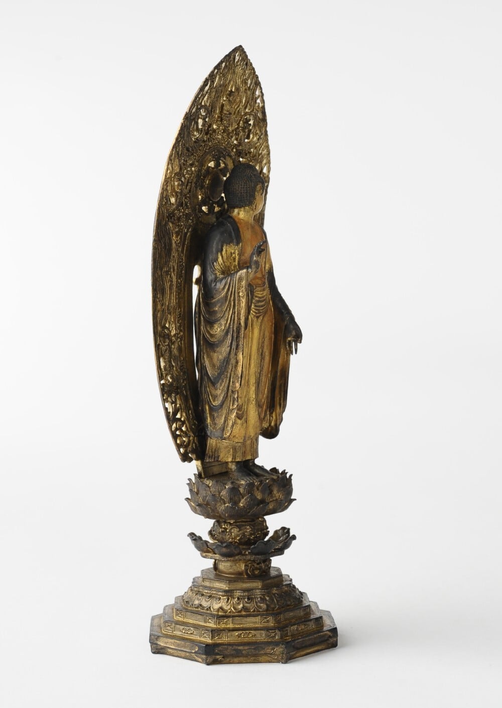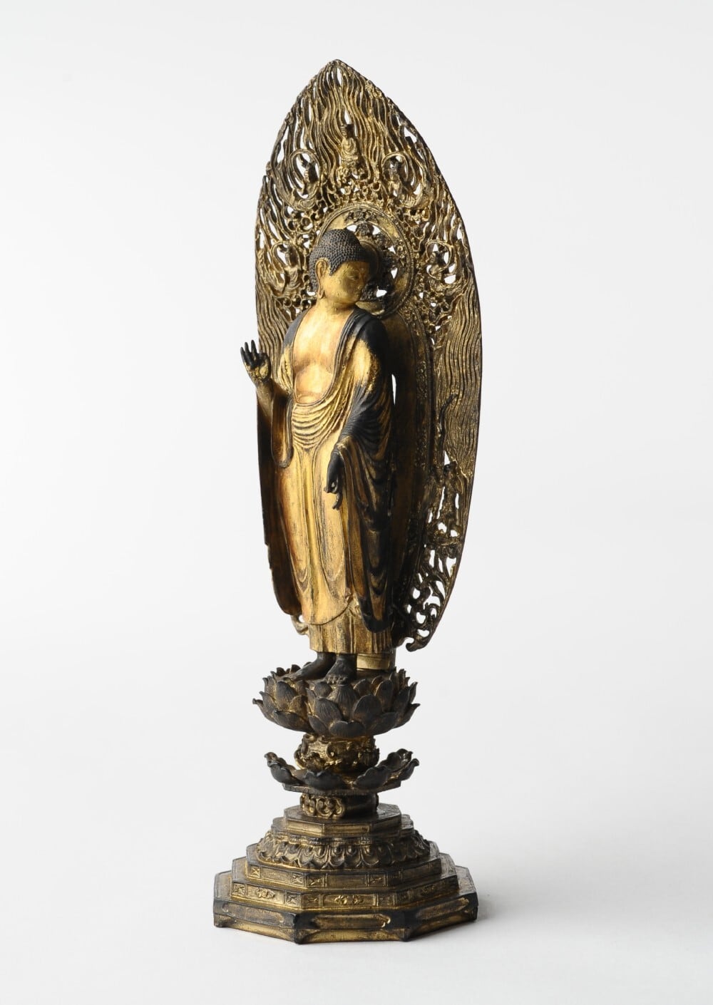 モデルは京都にある重文「木造 阿弥陀如来立像」。後ろをふり返るという姿勢は大変珍しいもので作例は多くありません。若々しく堂々としたその顔には気品と慈愛が漂い、バランスのとれた頭身や繊細な光背と相まって優美な印象を与えます。